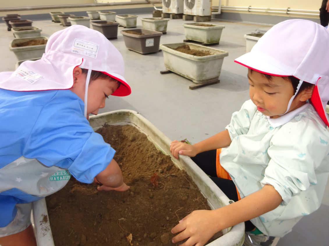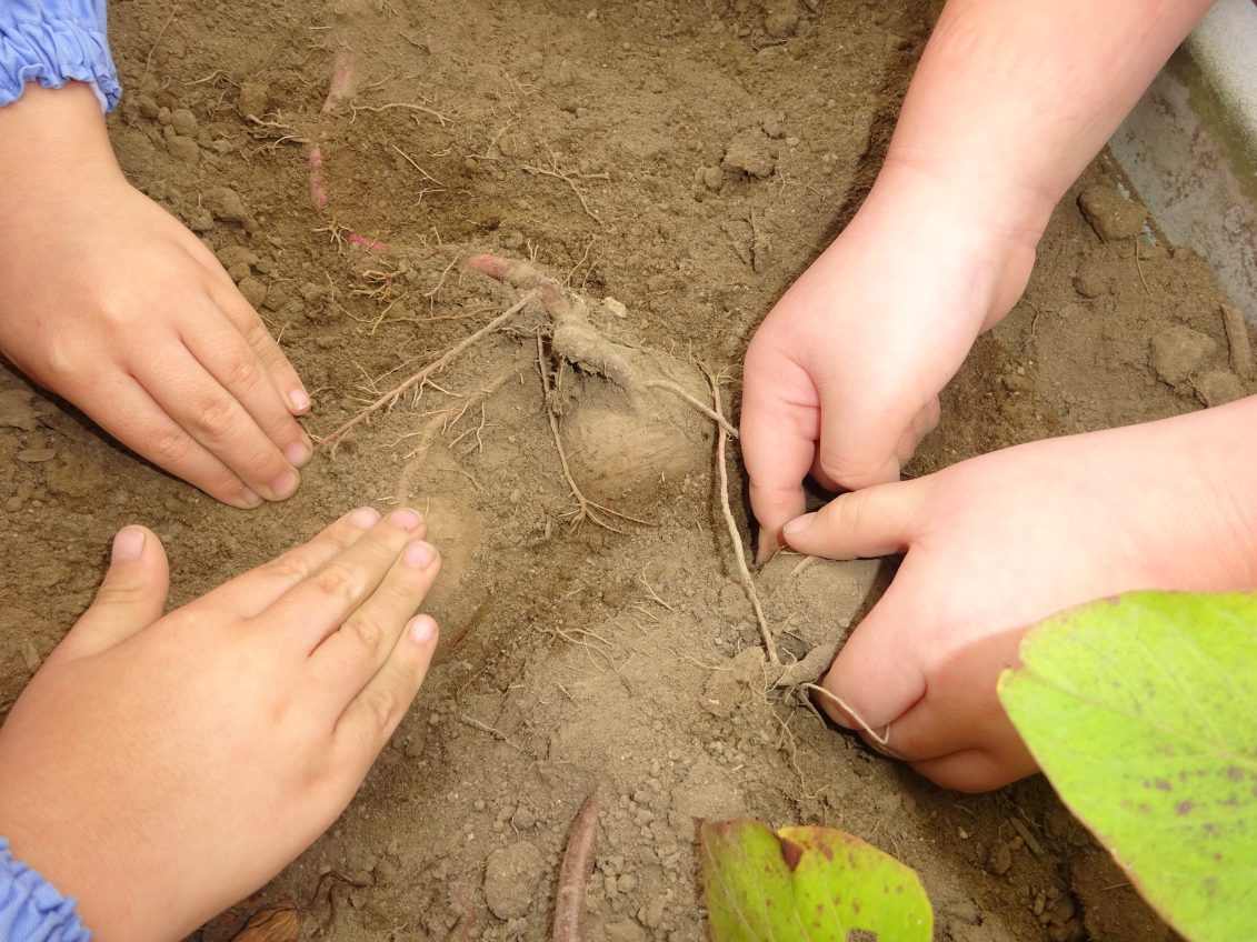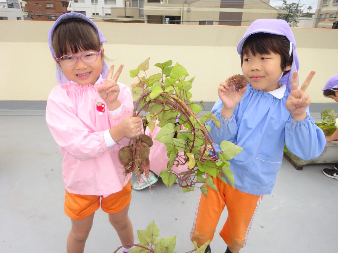 屋上で、お芋掘り! 2025年11月5日 5月に苗を植え、記録的な暑さを乗り越えた屋上プランターのさつまいも 「おいも、大きくなっているかな~」と楽しみに掘り始めた子どもたち。 あった~と嬉しそうにお芋を手にしていました 今年は、少し小ぶりでしたがとっても甘そうなお芋でしたよ